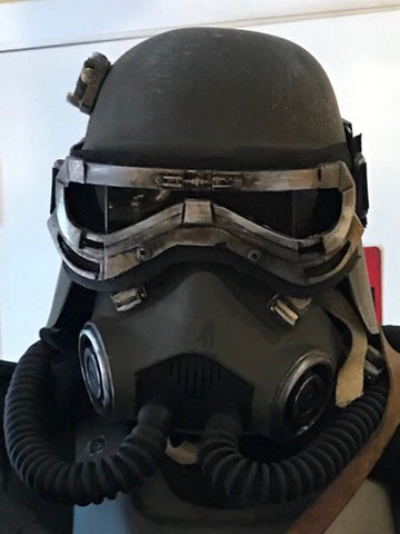 Ready to wear or display Mud Trooper helmet. Fiberglass helmet with a skate helmet inner lining. The goggles are cast in resin. Includes all the buckles and straps already in place. Painted and weathered to look like you stepped off the set. Please allow 3 weeks for production. Does not include hoses, sold separately. If you are interested in this helmet as a kit, please look for the other listing.