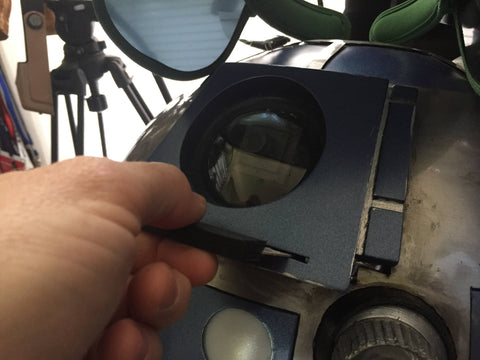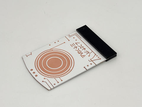 This is a laser cut and engraved copper coated fiberglass plate with a hard plastic handle that is screen accurate with the data chip used to transfer the plans of the Death Star into the hands of Princess Lea and eventually into R2D2. Unlike plastic replicas, this has the look and feel of being a real data transmission device. The data plate is sized such that it will fit in the slot below the eye of a spec Astromech Builders Club full size R2D2. The writing on the card says "Death Star" Though it is unclear if there was any writing on the screen used card in this location, this area is covered by the man's thumb, this seemed appropriate.