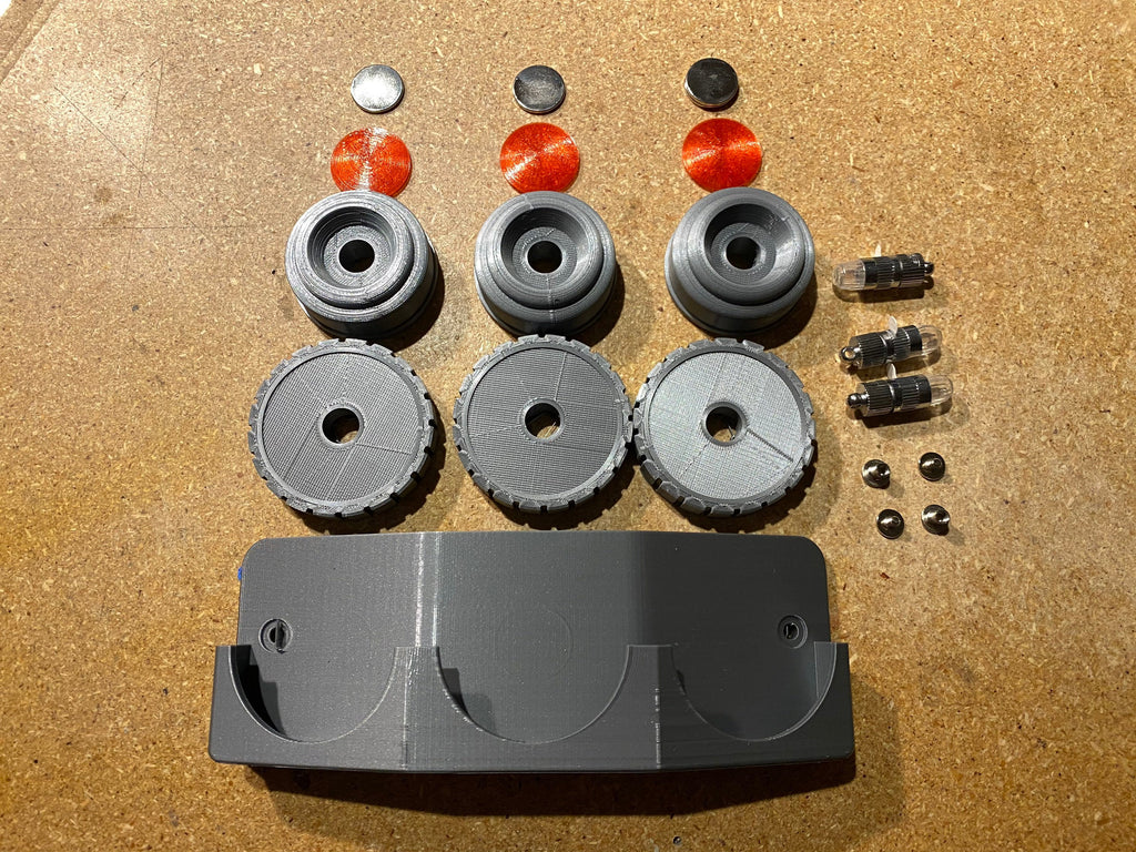 3d printed kit to make the Mandalorian’s belt charges. These are designed to use small blinking LEDs powered by watch batteries. Twist them on and off. Includes - 3 3d printed charges - 3 red 3d printed translucent lenses - 3 blinking LEDs - 6 magnets - 2 Chicago screws to attach holder to belt - 3d printed belt holder.